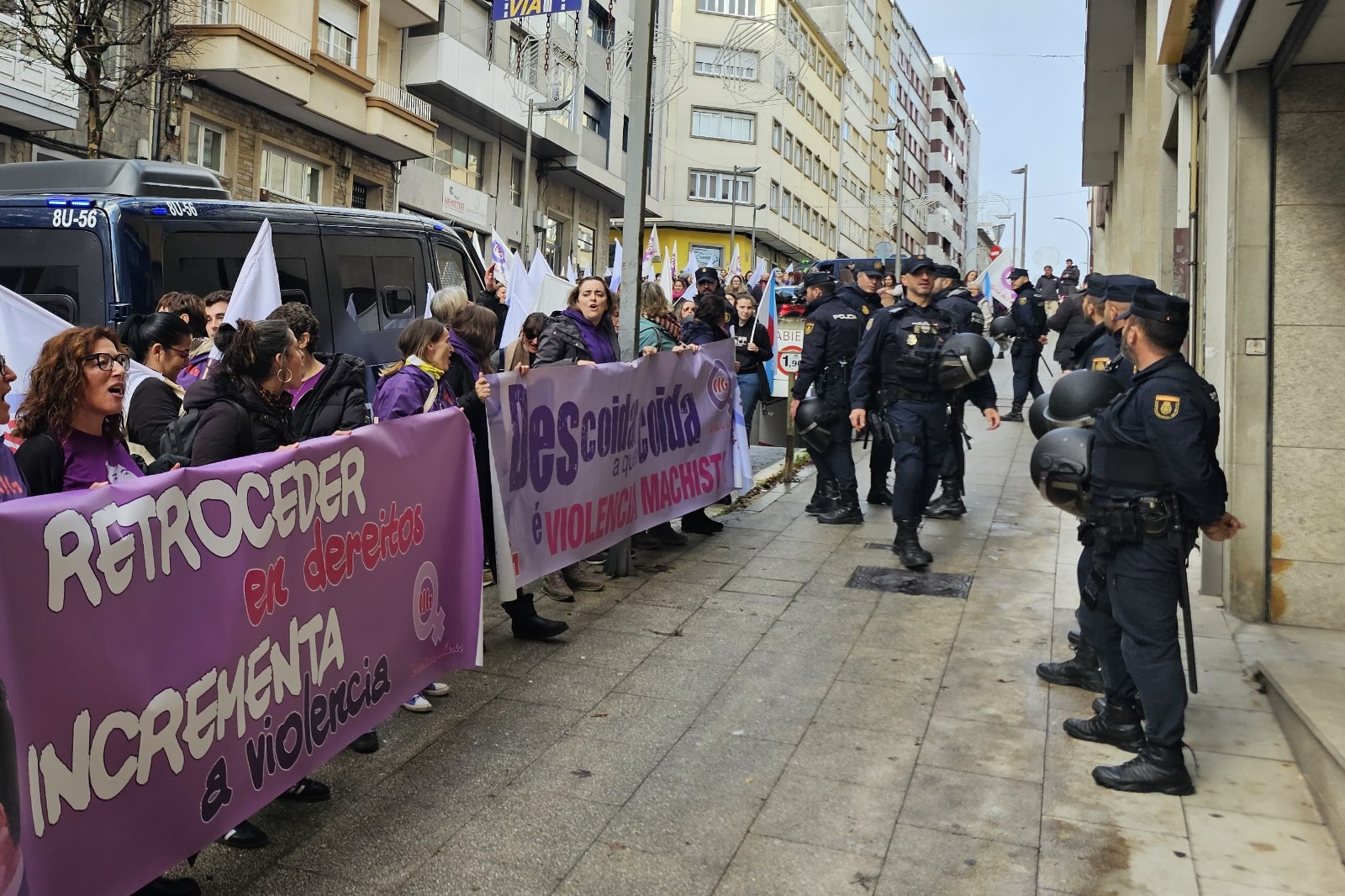 Aseguran que a manifestación “saldouse coa coacción e o increpamento a través da violencia verbal a traballadoras do PP de Santiago e mesmo a xornalistas que cubrían o acto ao berro de ‘cómplices de asasinatos e de acoso machista’”. Uns feitos que, “dada a escalada de violencia”, mesmo obrigaron á intervención da Policía Nacional.